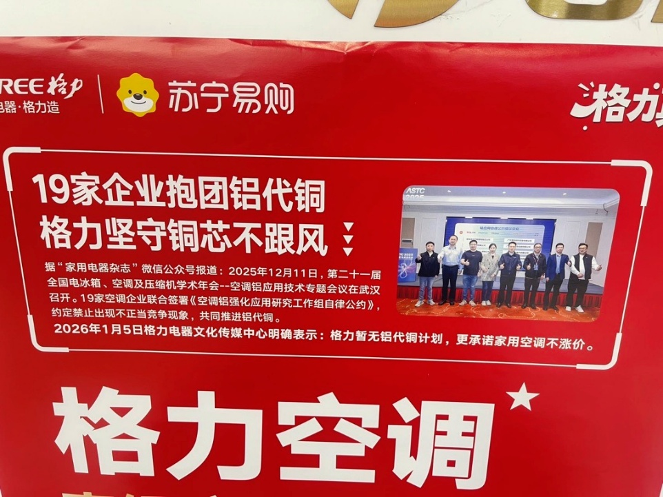 格力对外反复宣称“拒绝铝代铜、坚守真铜实料”,甚至将竞争对手工程师签约照片用于线下终端宣传。