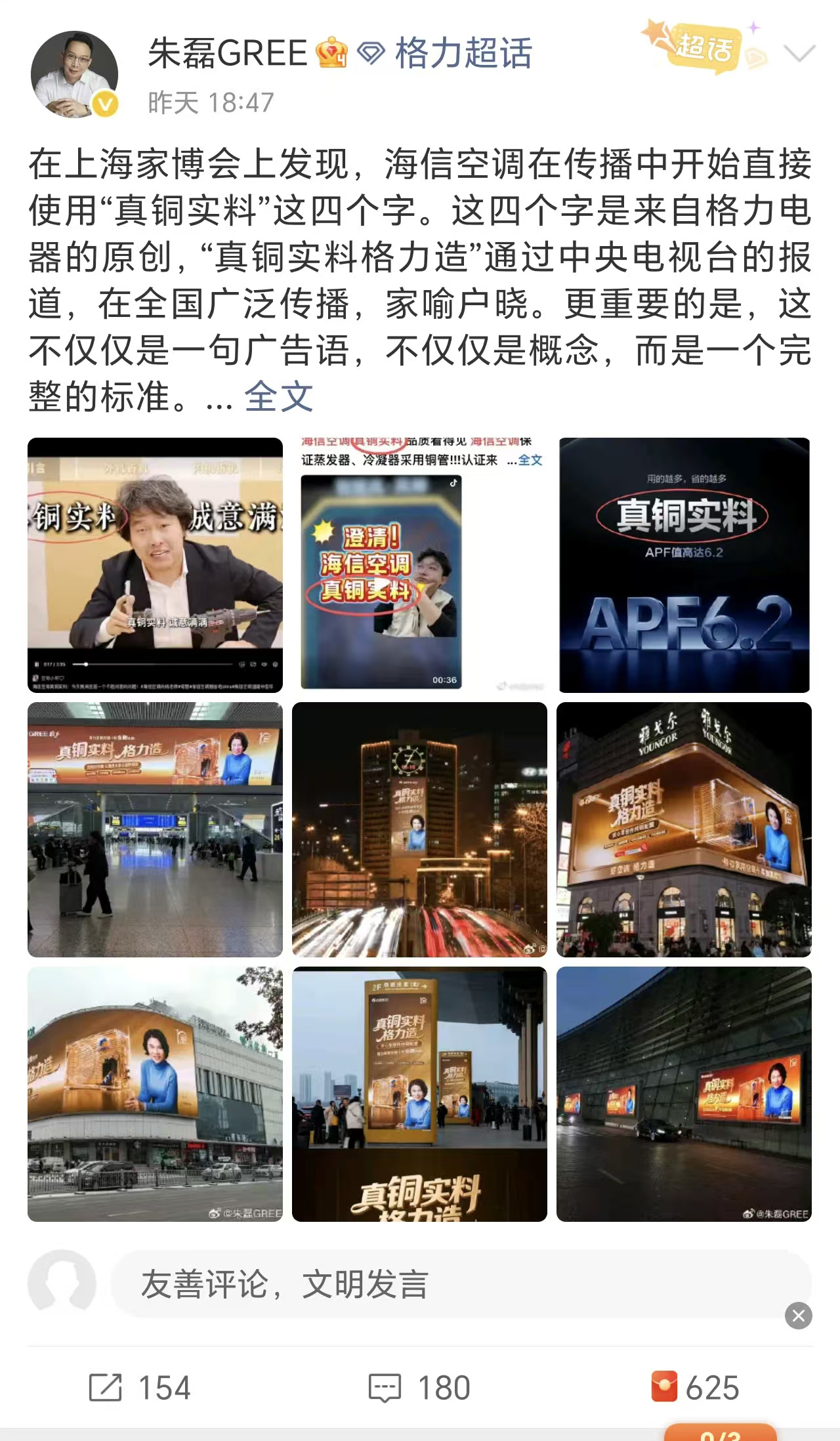 4月14日晚间,格力集团品牌总监朱磊发布微博,炮轰海信空调使用“真铜实料”宣传语,声称该表述为格力原创,且为此标语“花了大价钱”,此举不仅引发双方新一轮口水战,也再度引爆消费者对整个空调行业持续已久的“铝代铜”舆论争议。
